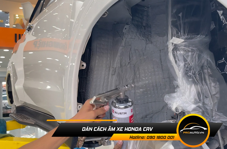 Việc dán cách âm chống ồn xe Honda CRV hiệu quả không chỉ phụ thuộc vào việc chọn cách âm, tiêu âm chất lượng mà còn phụ thuộc vào quy trình và kỹ thuật thi công cách âm đạt chuẩn. Để xịt phủ gầm ô tô, người thi công phải tháo bỏ các bộ phận như bánh xe, các kẽ nhỏ, hốc bánh xe,… giúp cho việc vệ sinh được sạch sẽ. Ở phần gầm xe, bỏ các lớp cách nhiệt giữa phần ống bô và phần thân xe.
