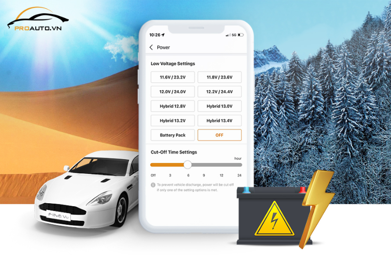 • Đầu tiên, tính năng tự động ngắt nguồn theo giá trị điện áp đã được cài đặt trước giúp bảo vệ bình ắc quy khỏi tình trạng cạn kiệt. Người dùng có thể tùy chỉnh ngưỡng điện áp an toàn, như 12.2V hoặc 12V, dễ dàng thông qua ứng dụng Finevu trên điện thoại.